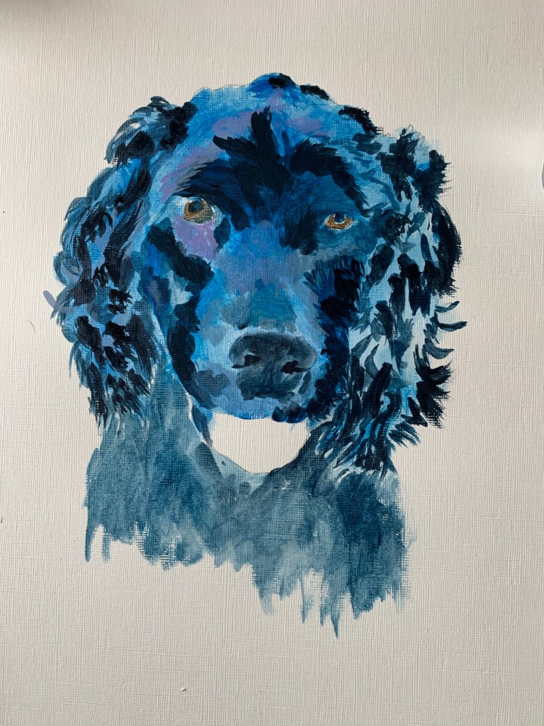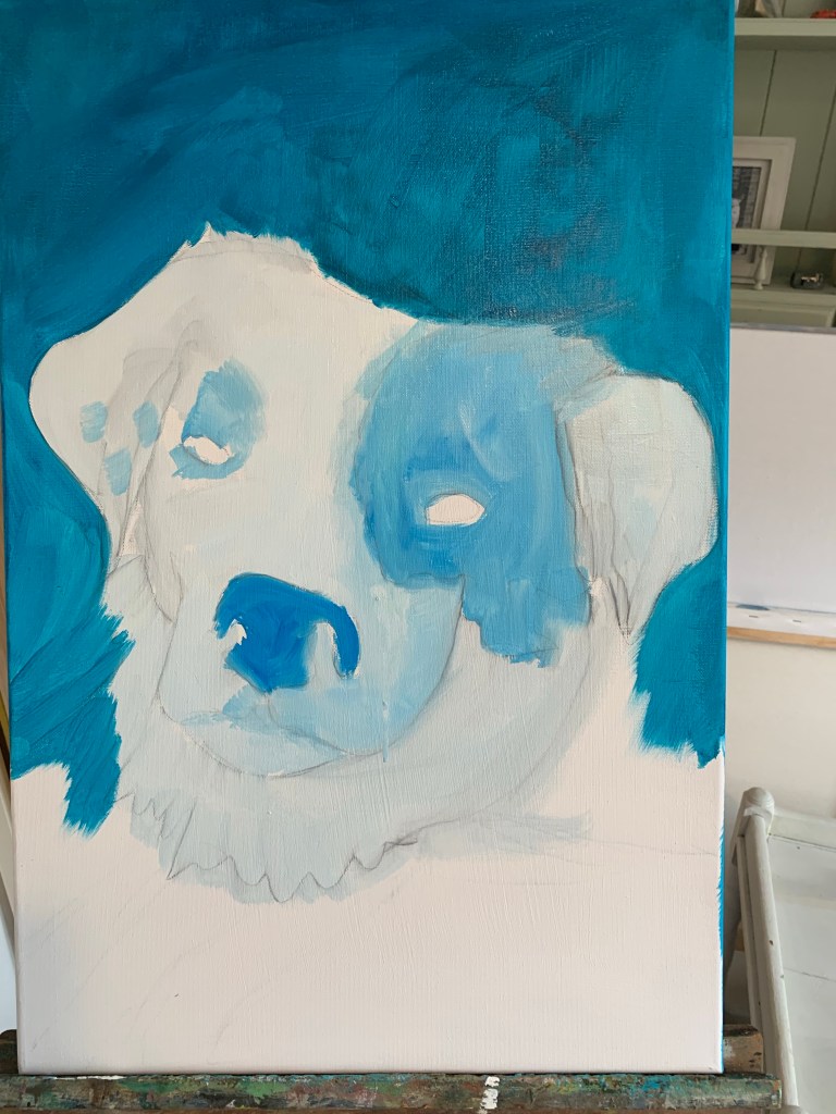 Over on Instagram I have been sharing my painting journey of my recent commission, a Collie x who is mostly white with black markings. As part of my journey I photograph and often video each stage of my process for the customer so they can see my progress and let me know if they want anything changed etc. It makes the customer inclusive and apart of their paintings journey from photo to canvas it makes the process more special for both of us. on the odd occasion I’m allowed to share the process in real time, this doesn’t happen very often because the portrait might be a gift for someone. I was asked on stories by a few people why I was painting the black patches blue?