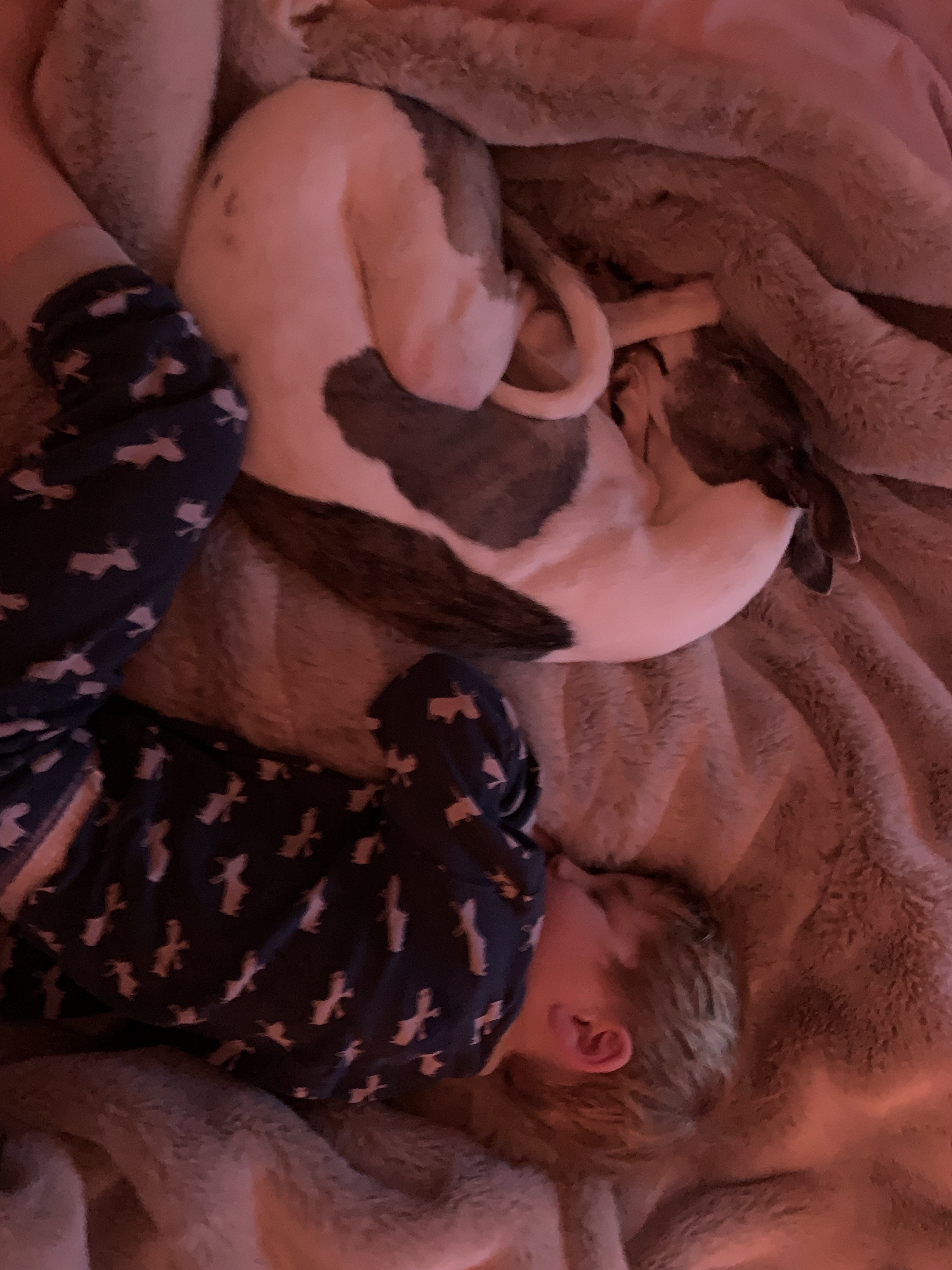 When I met my husband I still had Max, and Molly was about a few months old and despite not being a “doggy person” fell in love with them both, but particularly Molly. She idolised him. Sadly Molly passed away aged 8 from cancer. She went too soon and It still hurts. Loosing max was hard, he was our first dog and Molly didn’t live the full life she should have done. Before her passing we got Stan the whippet who we still have now and who will be 11 in December. Not long after loosing Molly, my mum rescued Izzie, a staffi cross, mum was living in her own as I was living with my husband and my eldest son was now 17 months. Izzies grown up with my kids and is a wonderful dog with them, she patient and calm. And she got my mum through lockdown last year. We all now live together so I’ve gone back to having 2 dogs in the house and I love it. My husband won’t admit it but he loves it too, and I think he’s a converted dog lover now especially with Stan. Stan’s his boy (apart from our sons of course) he gets up with him in the night to tuck him back into his sleeping bag (yes he has a Doddy sleeping bag)