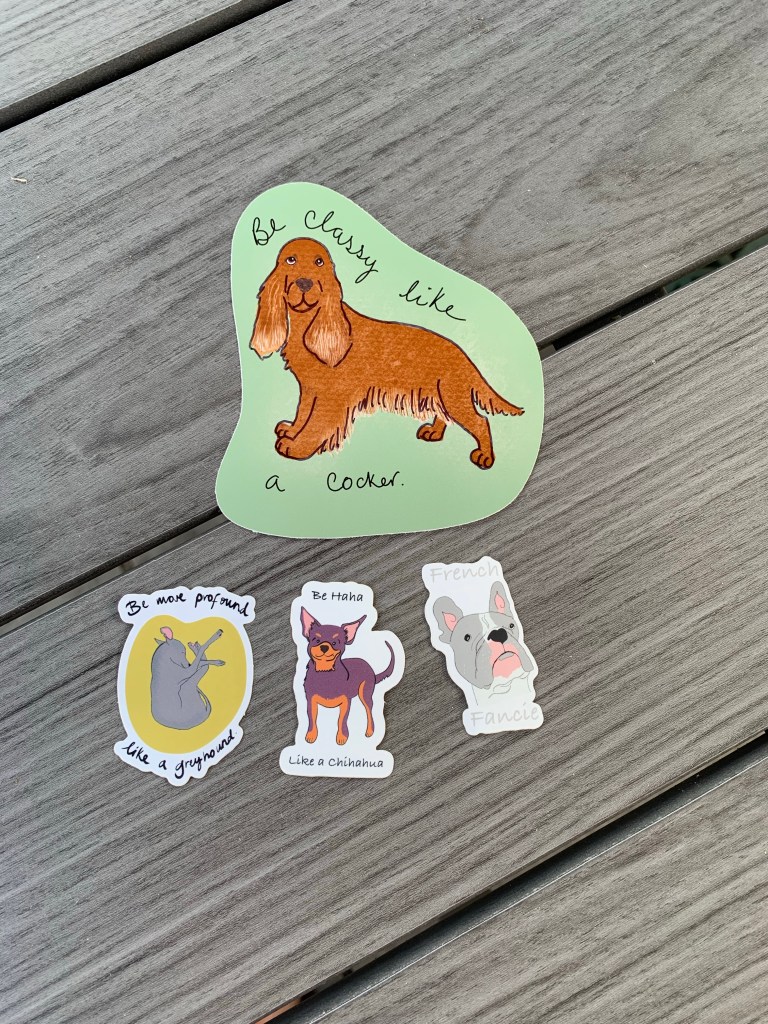 This journey was so enjoyable and I loved letting go and just doing something for fun and for myself. I’m also incredibly pleased and proud with how this collection has come out. I didn’t have any plans to release it but then I thought, what the hell, let’s just put them out there and let’s see how it goes. So with that here’s my latest collection, The Happy Dog collection. this collection consists of prints cards and new Stickers which I was soooooo exited about and happy how they have come out. So much so I brought my own Cricut machine to print my own stickers(still waiting for it to be delivered). This is so exciting and I cannot tell you how happy this makes me feel. I’ve also invested in a brand new fancy printer. I’ve been saving for a printer for so long now and I finally have one! I will be writing another blog post on both machines and sharing on social media so be sure to visit http://www.Instagram.com/jofrancesarts for that one!
